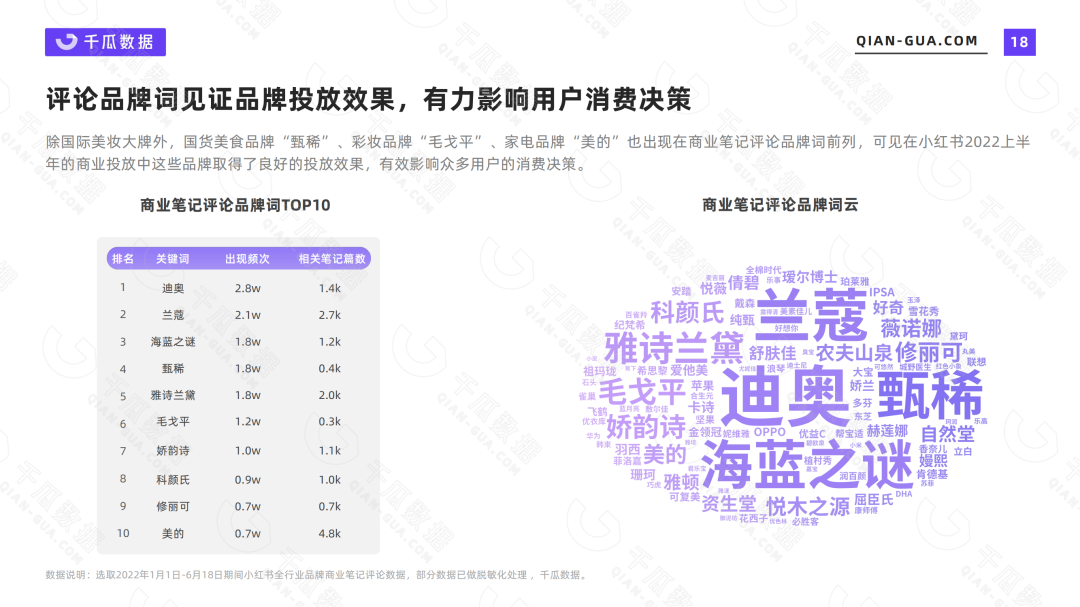 从商业笔记评论品牌词中可以验证品牌投放成效、发现用户关注的竞品品牌,除国际美妆大牌外,“甄稀”、“毛戈平”、“美的”等国货品牌跻身前列,影响了众多小红书用户的消费决策。