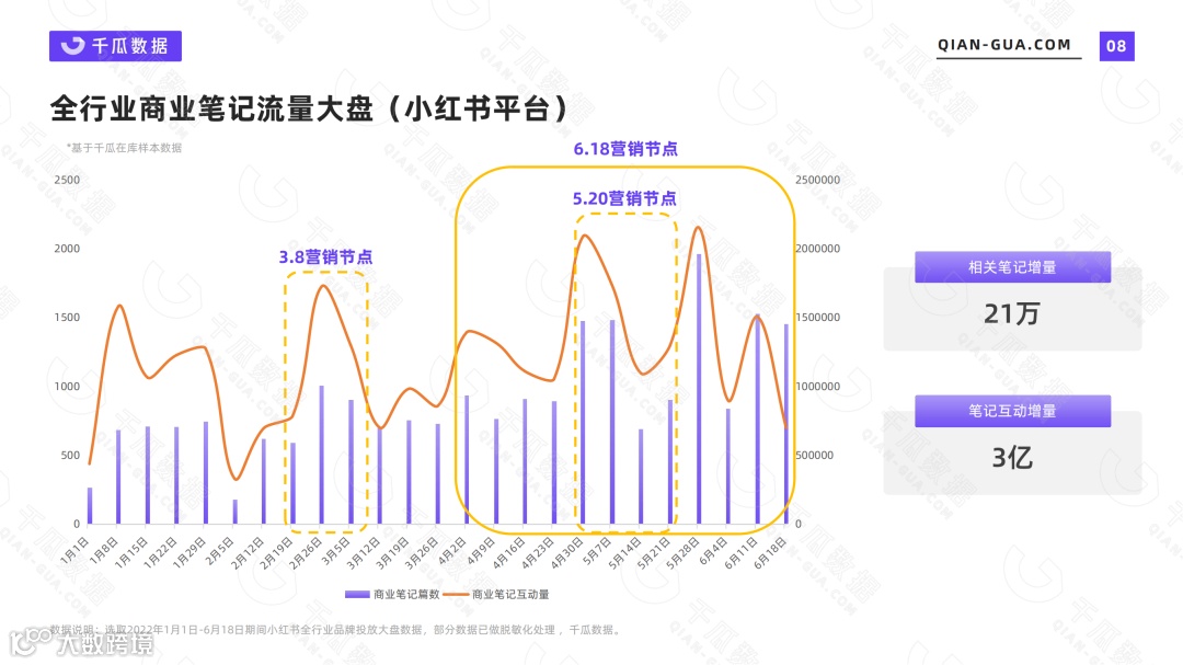 从全行业商业笔记流量大盘中发现,在各大营销节点之时,品牌会提前加大商业笔记内容投放,并在节点期间制造出多个流量波峰,在2022上半年期间相关商业笔记增量21万,笔记互动增量达3亿。