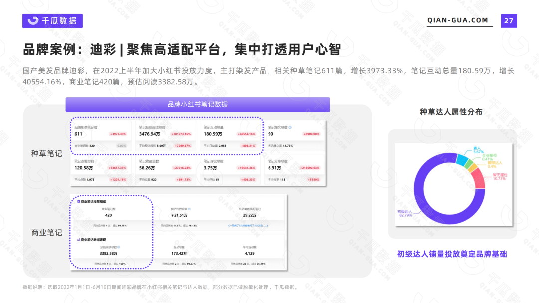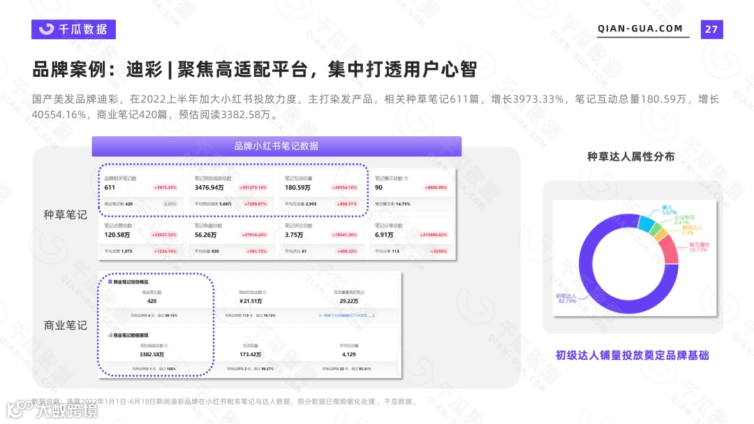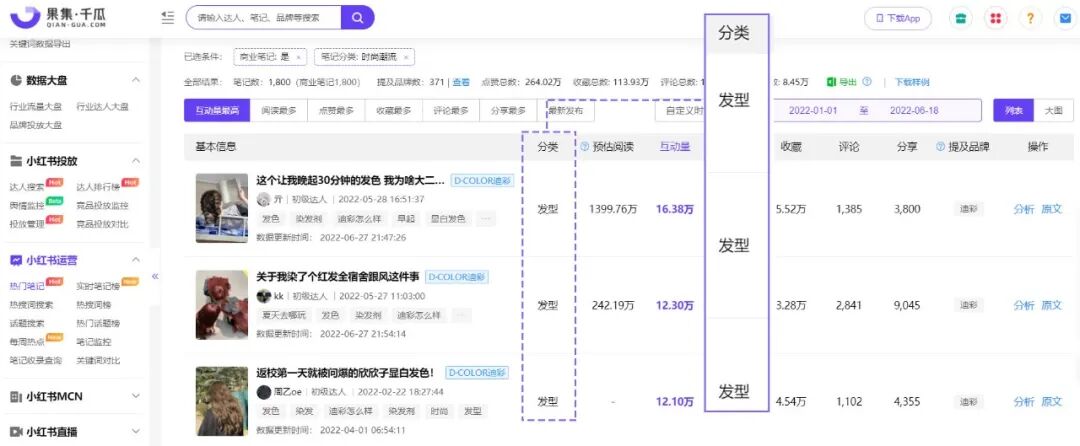 果集·千瓜数据显示,国货美发品牌【迪彩】在2022上半年加大小红书投放力度,并保持日常种草,相关笔记611篇,同比增长3973.33%,笔记互动总量180.59万,同比增长40554.16%。其中商业笔记420篇,预估阅读3382.58万,互动总量173万,是全行业商业投放榜前十中唯一一个国产品牌。
