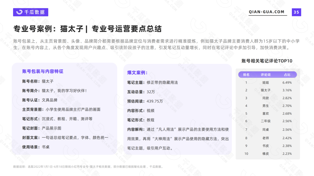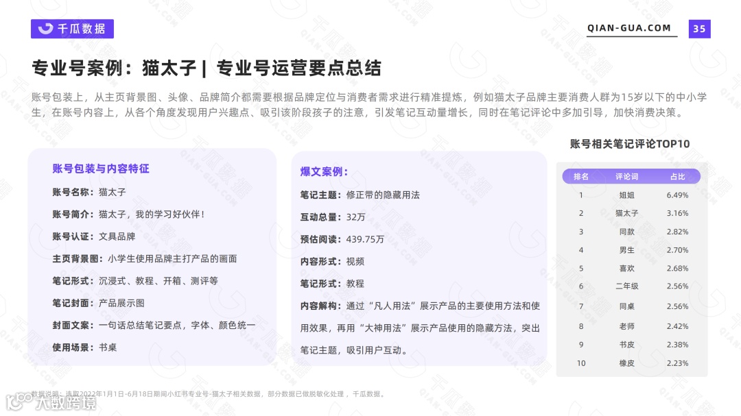 2022上半年粉丝增长率最高的文具品牌专业号【猫太子】,粉丝数量增长19万+,粉丝增长率1604%,以日均更新1.76篇笔记的频率在半年内为品牌带来9397万曝光,有效推动品牌爆款单品产生。