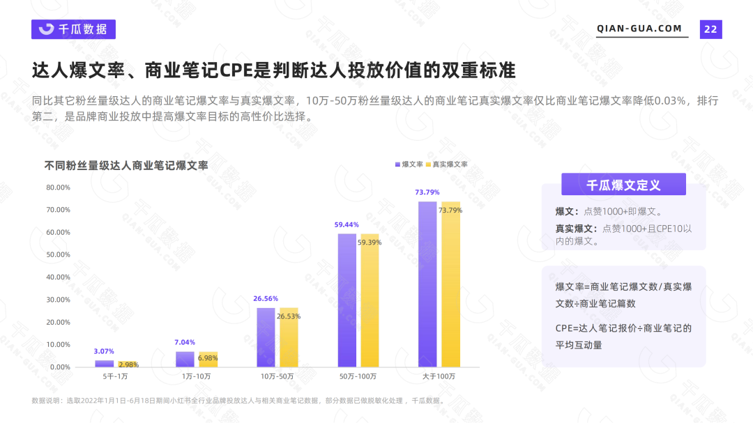通过汇聚2022上半年发布过商业笔记的达人和其商业笔记数据发现,粉丝量在10万-50万的达人商业笔记爆文率为26.56%,在此条件下,CPE在10以内的真实爆文率为26.53%,相对其它粉丝量级的达人仅下降0.03%,能为品牌带来更具投放性价比的爆文保障。