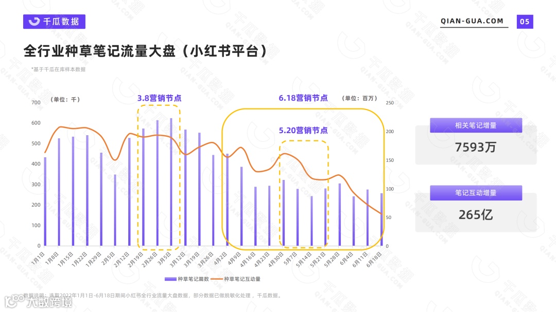 2022上半年,小红书行业流量数据依旧亮眼, 各大品牌相互角逐,经历三八妇女节、520、618等各大营销节点,累积种草笔记7593万篇,创造出近265亿互动总量。
