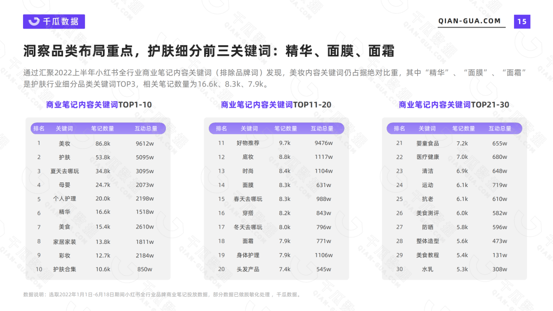 汇聚2022上半年小红书全行业商业笔记内容关键词发现,“精华”、“底妆”、“面膜”为护肤品牌主推的三大细分品类,相关笔记数量为16.6k、8.3k、7.9k,在此趋势下,用户护肤意识逐渐提升,相关内容成为关注焦点。