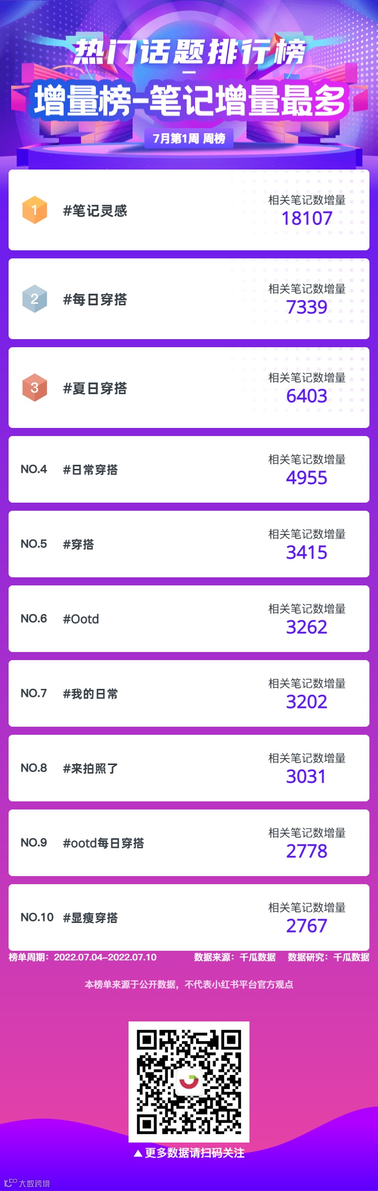 热门话题排行榜-增量榜-笔记增量最多中“笔记灵感”排名第一,相关笔记数增量18107;“每日穿搭”排名第二,相关笔记数增量7339;“夏日穿搭”排名第三,相关笔记数增量6403。
