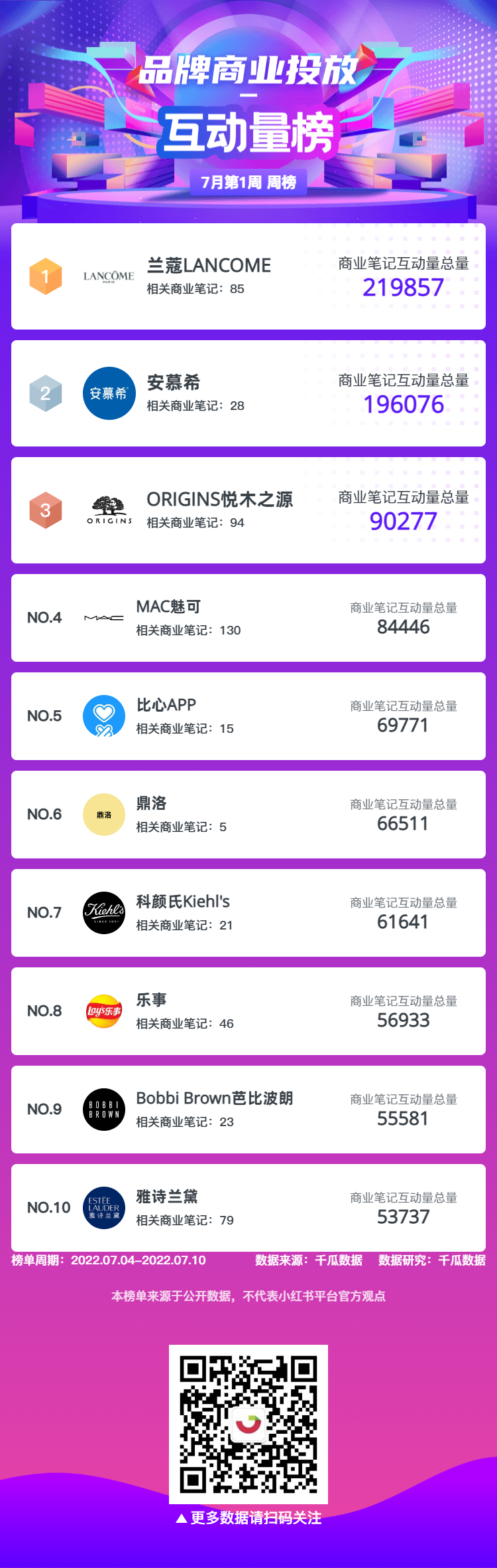 品牌商业投放-互动量榜中“兰蔻LANCOM”排名第一,商业笔记互动量总量219857;“安慕希”排名第二,商业笔记互动量总量196076;“ORIGINS悦木之源”排名第三,商业笔记互动量总量90277。