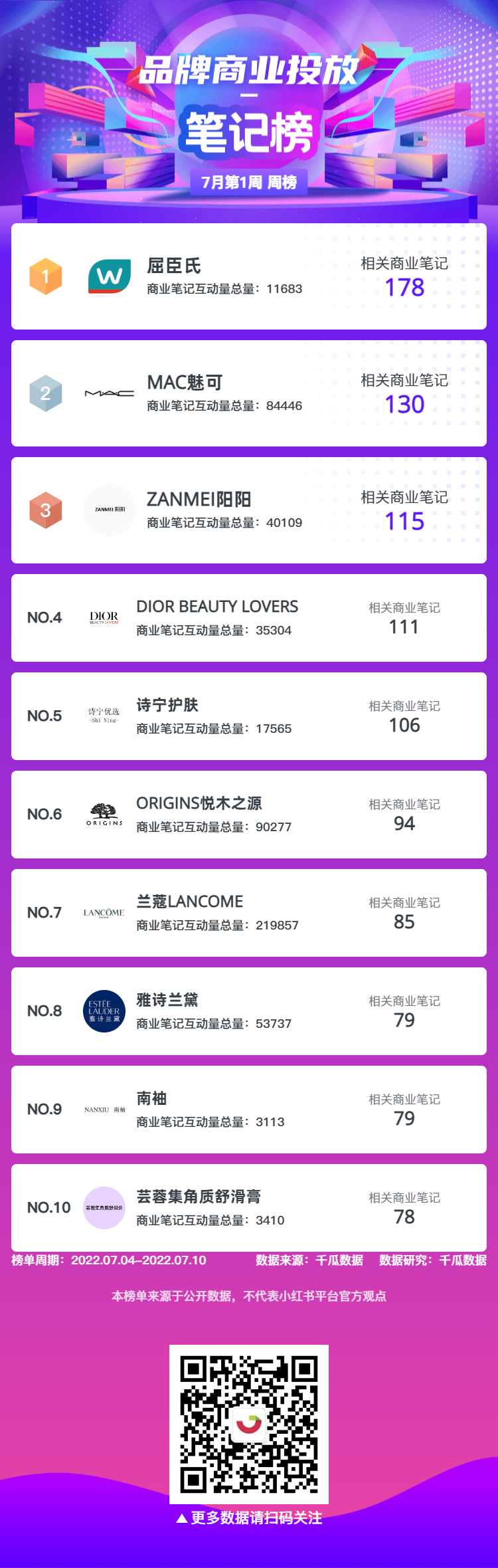 品牌商业投放榜-笔记榜中“屈臣氏”排名第一,相关商业笔记178篇;“MAC魅可”排名第二,相关商业笔记130篇;“ZANMEI阳阳”排名第三,相关商业笔记115篇。