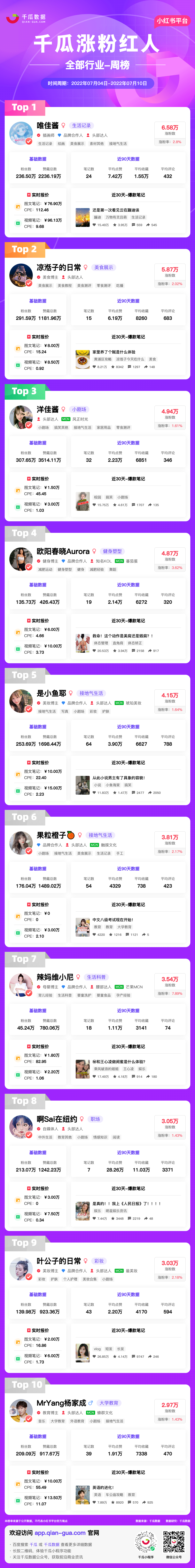 小红书涨粉红人-全部行业中“唯佳酱”排名第一,涨粉数6.58万;“凉湉子的日常”排名第二,涨粉数5.87万;“洋佳酱”排名第三,涨粉数4.94万。
