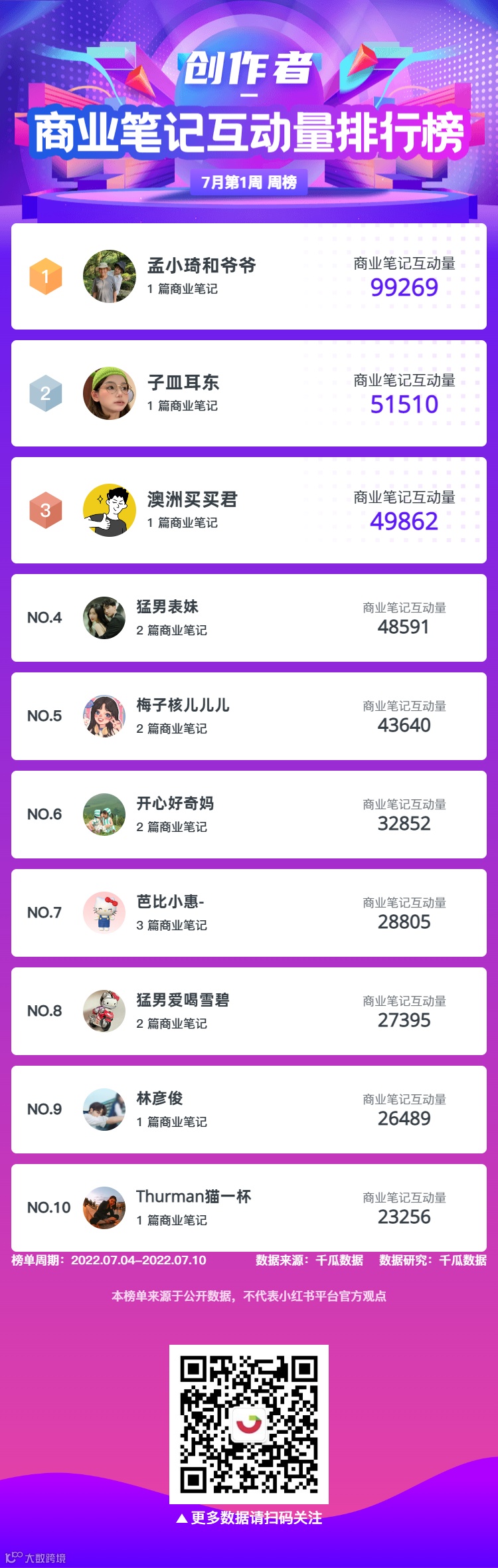 创作者-商业笔记互动量排行榜中“孟小琦和爷爷”排名第一,商业笔记互动量99269;“子皿耳东”排名第二,商业笔记互动量51510;“澳洲买买君”排名第三,商业笔记互动量49862。