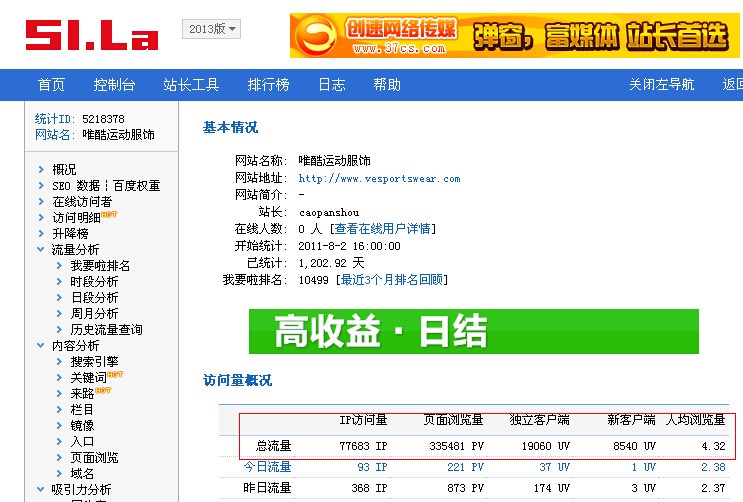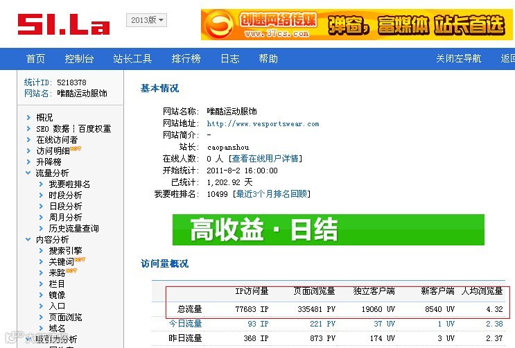 网站做好后,差不多每天花一个小时来做上面的推广工作,三个月后网站每天访问量达到30IP,一年后达到100IP,现在每天200多IP。下面是我网站的一些数据: