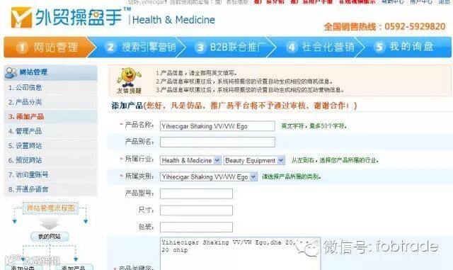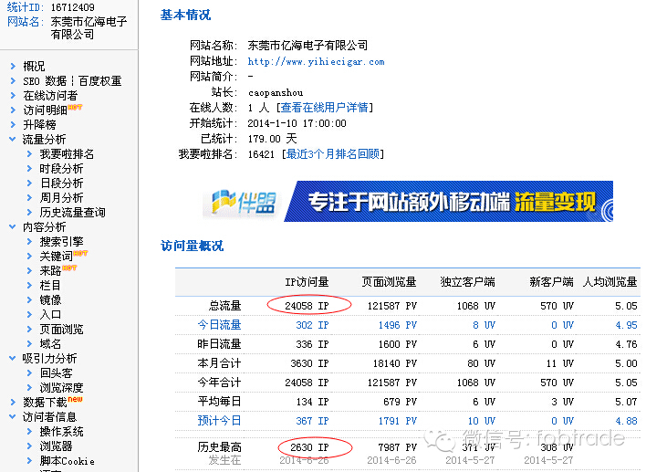 选择了自己品牌一致的域名(www.yihiecigar.com),购买了推广易服务(包含建站、搜索引擎优化、B2B群发、社交媒体分享和网络营销培训),通过一系列的网络推广,网站访问量稳定在四五百IP,最高一天是2600多IP,询盘最多一天达到36个,忙得工厂订单接不过来。以下分享一下我是怎么把网站推起来的。