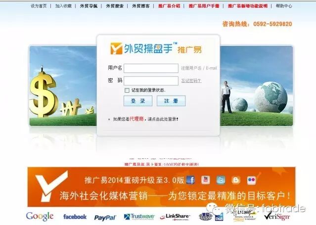 外贸操盘手推广易是根据外贸操盘手团队的实战经验、倾力打造的国内第一家海外推广“一站式”全网营销服务平台。“推广易”集外贸营销型网站建设、搜索引擎优化、全球B2B平台联合推广、全球社会化媒体营销于一体,出口企业只需登陆“推广易”后台,即可完成以上推广工作。