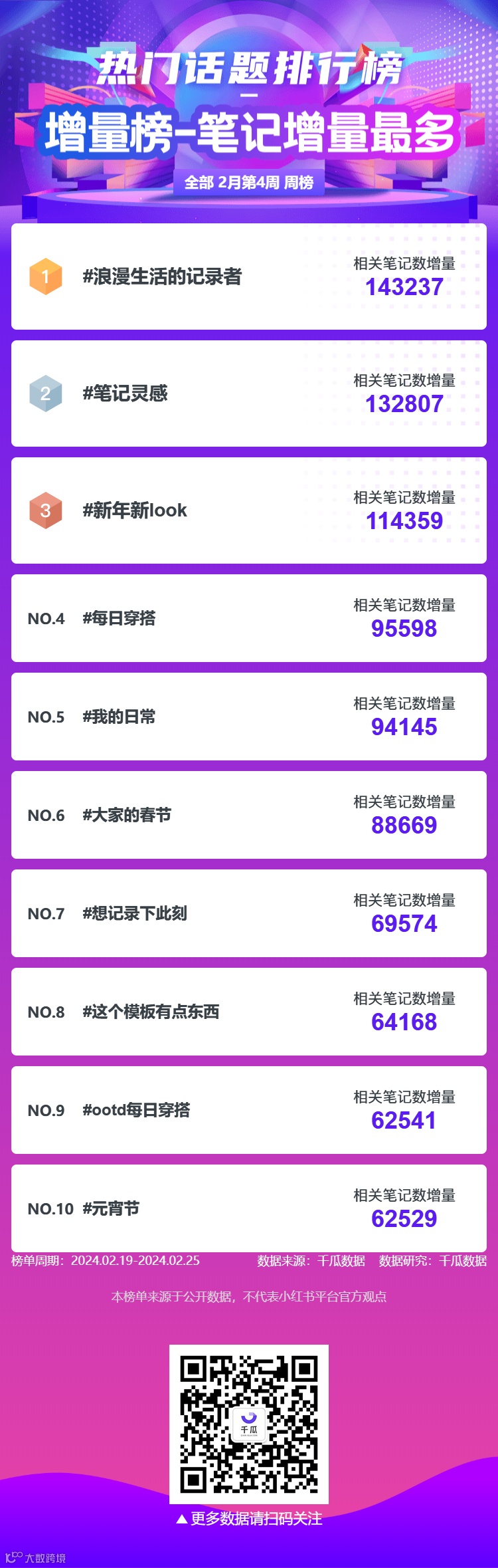 热门话题排行榜中“#浪漫生活的记录者感”排名第一,相关笔记数增量143237篇;“#笔记灵感” 排名第二,相关笔记数增量132807篇;“#新年新look”排名第三,相关笔记数增量114359篇。