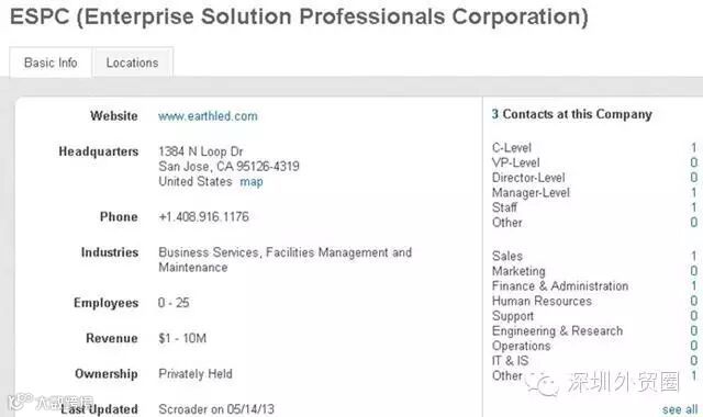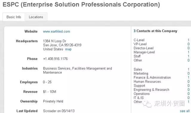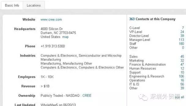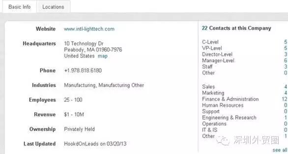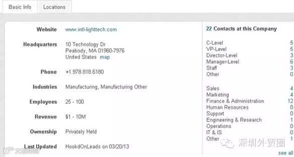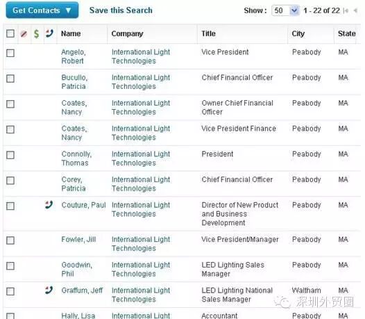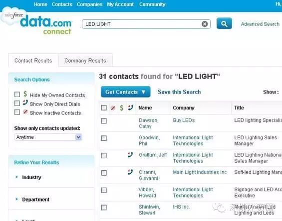 比如我们搜索LED LIGHT,出现如下界面,马上就出现了客户的名字,公司名称,主要做什么产品等信息,一目了然。