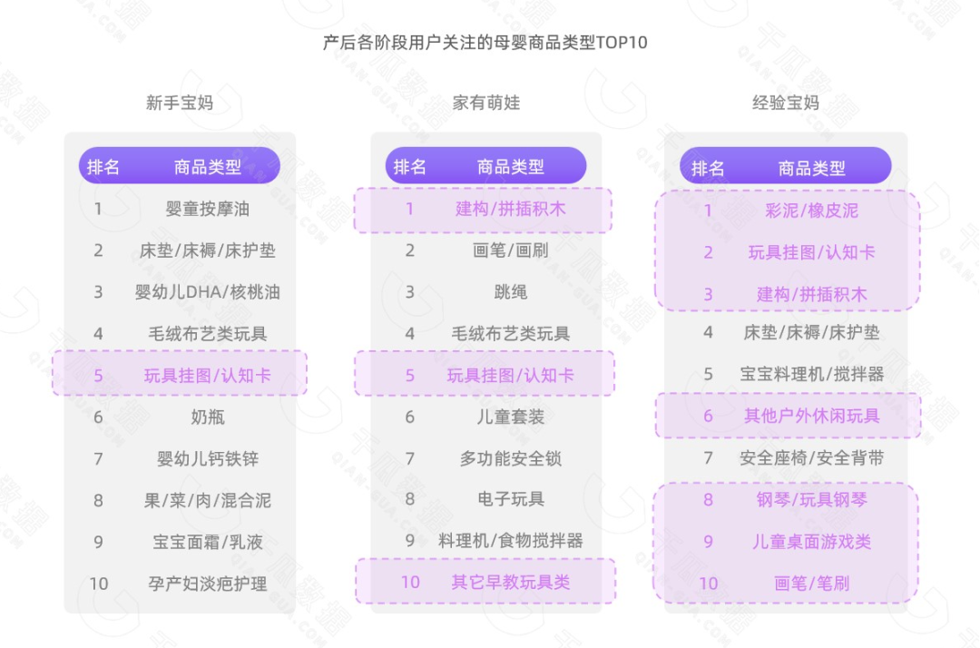 孩子成长阶段的不同,通过玩乐实现教育的目标与意义也不尽相同。孩子成长初期注重认知教育,“玩具挂图/认知卡”类别商品话题表现活跃。伴随着孩子的成长,宝妈开始同步关注动手能力的培养,希望通过“建构/拼插积木”等相关商品激活孩子的思考与动手能力。经验宝妈则在孩子成长教育多元化上下足功夫,“钢琴、美术”等相关品类热度提升。