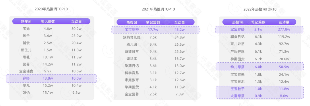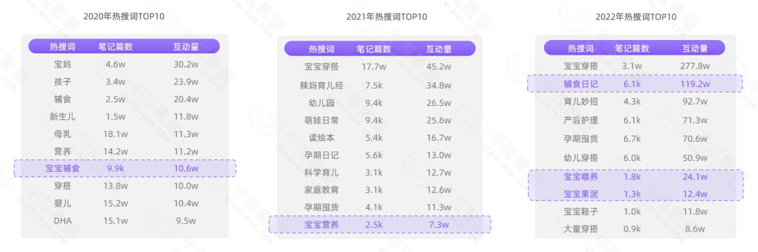 在2022年热搜词TOP10榜中,可以看到关于“宝宝辅食”的话题分别占据第二、七、八位,相较过去两年,话题热度明显增强。目前母婴行业进入新消费时期,年轻一代父母对孩子的科学喂养需求明显高于父辈,这也带动着母婴喂养品类的升级,辅食成为ta们关注的新焦点,正逐步成为宝宝营养补给的新角色。千瓜认为,未来相关母婴品类营销或可结合用户喂养需求的新特征,针对营养和功效解锁多元化营销新场景,实现精准埋点,触达消费客群。