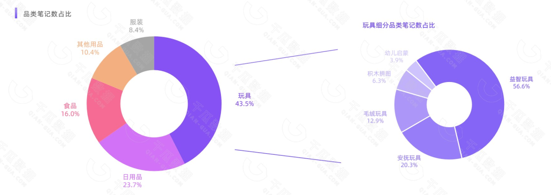 玩具品类笔记数量占比高,但用户互动热度仍有一定上升空间,千瓜建议相关品牌方在平台投放时关注内容创作,特别注重产品营销场景的营造,从用户使用、生活场景等出发,通过相关内容创作引发用户共鸣加入互动,或可带来更好的热度效应。同时尝试与产品匹配度较高的头部达人合作,探索新的舆论话题风向,带来更多流量效益。