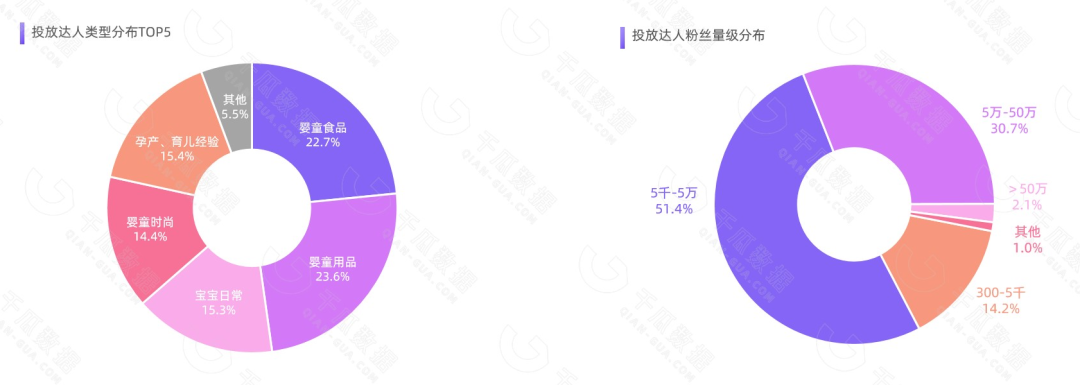 数据显示,母婴行业投放达人类型垂直性较高,达人类型均与婴童、孕产、育儿相关,而考量达人粉丝量级时,品牌方投放多集中在粉丝量级5千-5万、5万-50万的达人,合计占比超八成。
