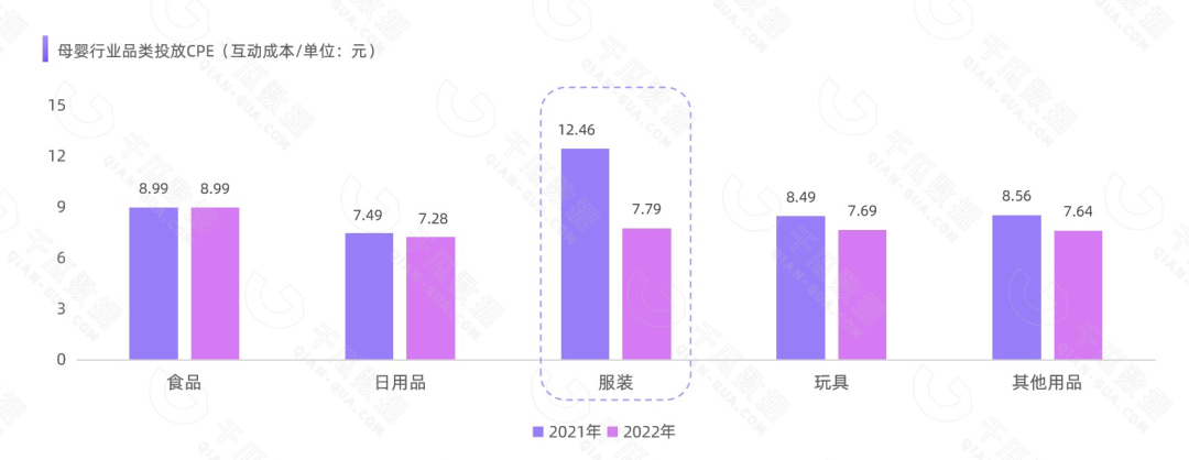 互动成本数据显示, 2022年母婴行业各品类CPE较2021年总体呈下降趋势,其中服装品类CPE下降明显。千瓜推测,投放成本的降低或与近一年来小红书母婴人群用户自发分享的积极性提高有关。