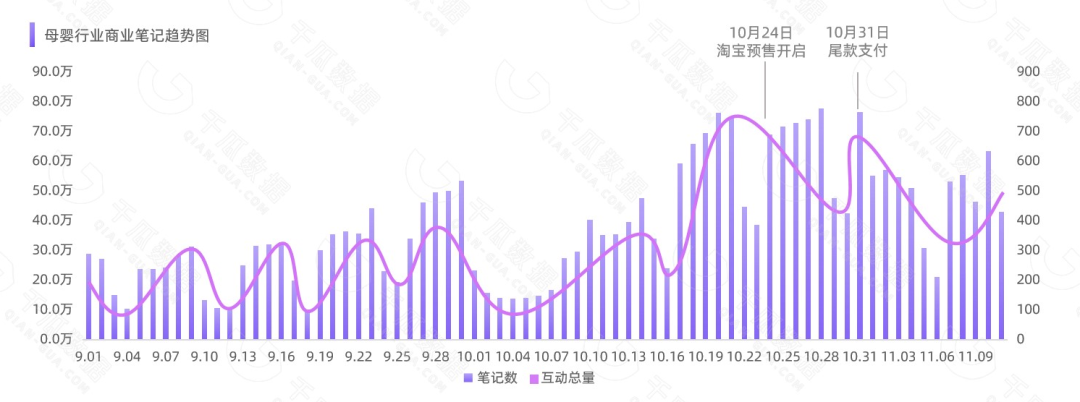 9月起母婴行业进入双十一流量期,9月预估笔记总量约20万+,预估互动总量近3000万;国庆后流量热度大涨,互动量连续两次攀至峰值,10月至双十一前后,预估笔记总量超32万,预估互动总量超4900万,较9月增长63%。
