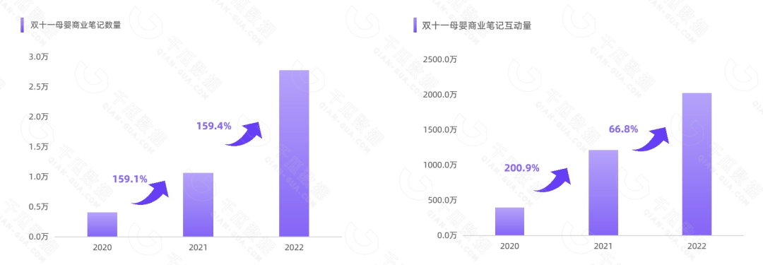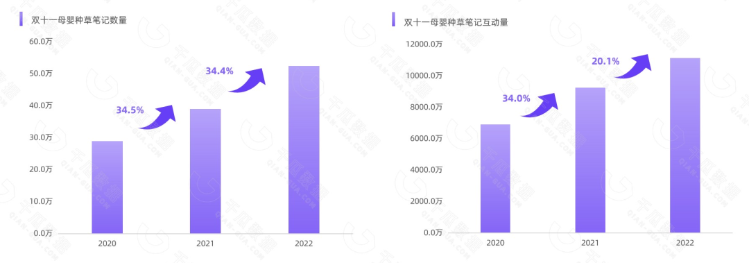 千瓜数据显示,双十一小红书母婴行业种草笔记数、用户互动量连年增长。同比2021年,种草笔记数增长34.3%,用户互动量增长20.1%,增速稍有放缓,但依旧增长稳健。千瓜认为,母婴行业群体特征与平台用户特性匹配度高,小红书正在成为母婴品牌的重要发声地,品牌与用户的“双向奔赴”有望把小红书打造成母婴生活届的“百科全书”。