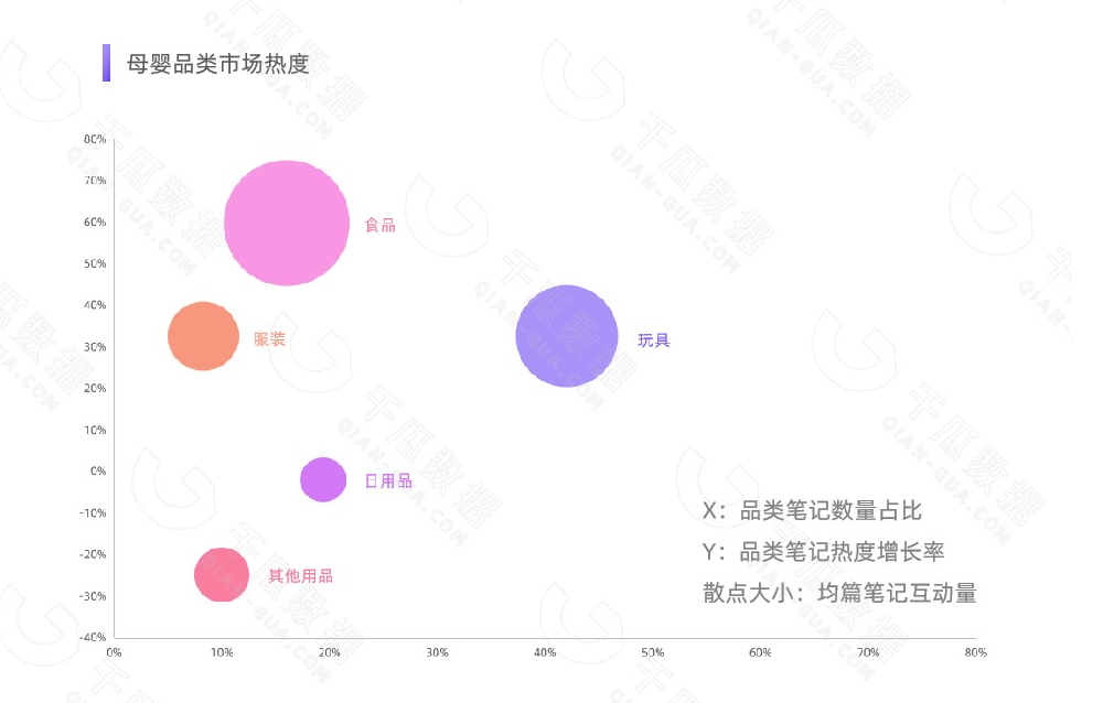 结合品类笔记热度与用户互动增长情况,其中玩具、服装、食品三个品类值得关注: