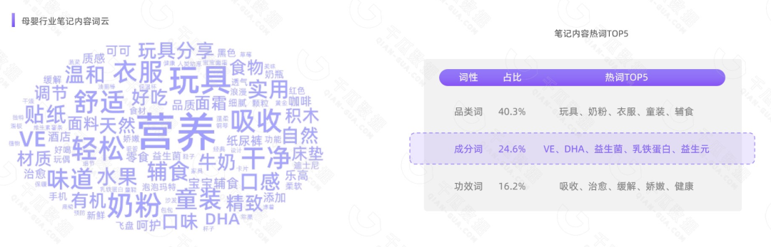 千瓜推测,母婴人群的知识文化水平的不断提升,涌现出越来越多爱学习爱研究的“成分党”。ta们热衷于探究“成分”,确保安全、健康且对宝宝有益后才会种草。千瓜建议,相关品牌方在推广应当凸显成分品质,可尝试结合知识科普、专业测评、成分解析、用户反馈等多种展示功能,构建多元化种草场景,提升种草效果。