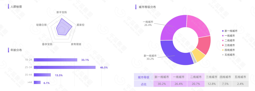千瓜数据显示,来自一线、新一线城市的年轻女性是关注母婴行业的主力人群,其中18-24岁人群渗透率达33.1%,25-34岁人群渗透率达46.5%。