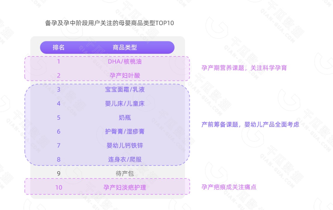 产前宝妈关注数据TOP10 如表所示,大致可分为三大类。最受她们关注的还是自身孕产期营养,DHA、叶酸相关品类商品备受追捧,这也是Z世代宝妈科学孕养意识增强的直接体现。怀揣对新生儿的憧憬,TOP3-TOP8品类均为宝宝相关,宝妈们开始为宝宝的出生做足功课准备。