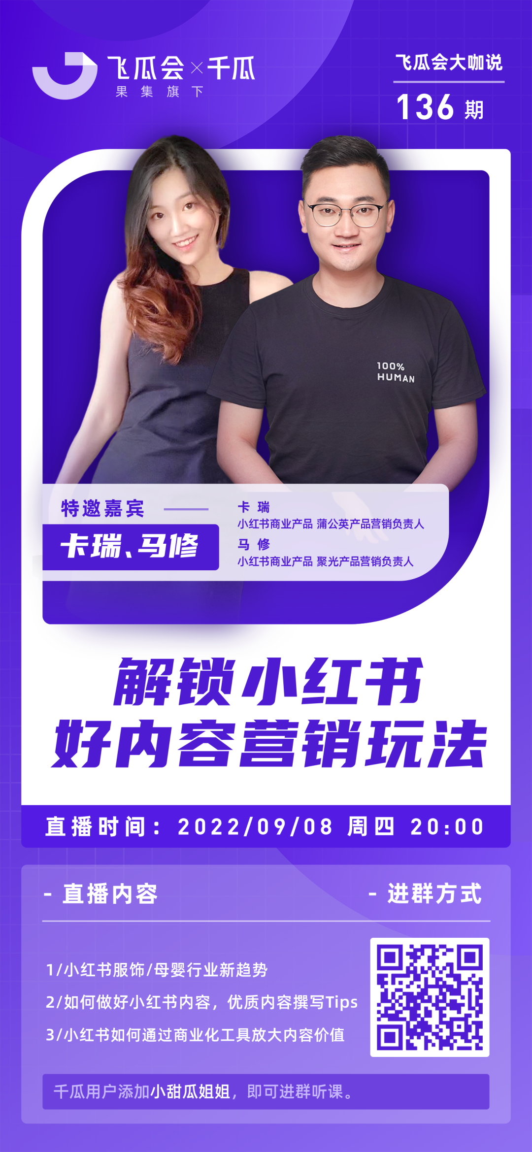 9月8日(本周四)20:00,小红书蒲公英产品营销负责人卡瑞、小红书聚光产品营销负责人马修 将与大家分享小红书最新的热门行业趋势、优质内容打造、扩大内容价值等,帮助大家解锁更多小红书平台营销玩法。