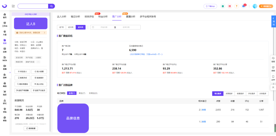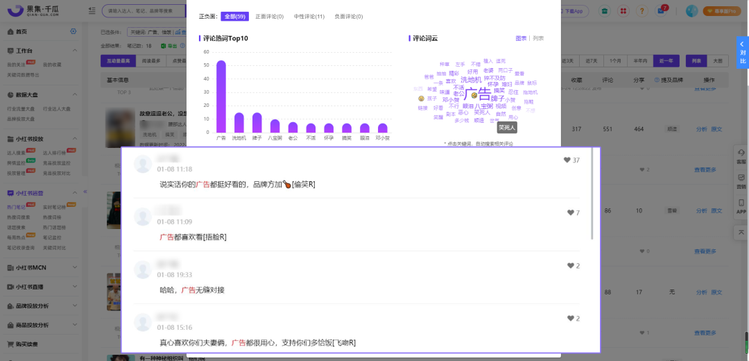 另外,接广质量也会影响达人形象,“有底线的恰饭人”,才能获得用户喜爱。可通过果集·千瓜数据查看达人近期是否接过推广、广告的舆情情况。挑选内容质量佳、广告舆情正面的达人。