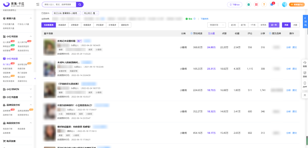达人笔记重点关注小剧场笔记及其数据表现,分析达人擅长哪种类型的小剧场。果集·千瓜数据显示,达人A近期点赞最高的笔记是小剧场,互动量为15.18万,同比其他笔记高出近3倍。浏览笔记列表,发现较擅长搞笑趣味型小剧场。品牌选择达人时,可将此作为分析依据。