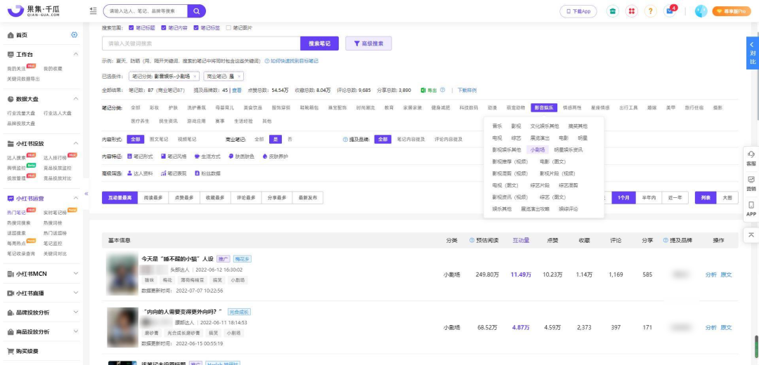 其中剧情类型,在果集·千瓜数据的笔记标签中能快速提取。如:搞笑催婚小剧场、亲子情感小剧场等。