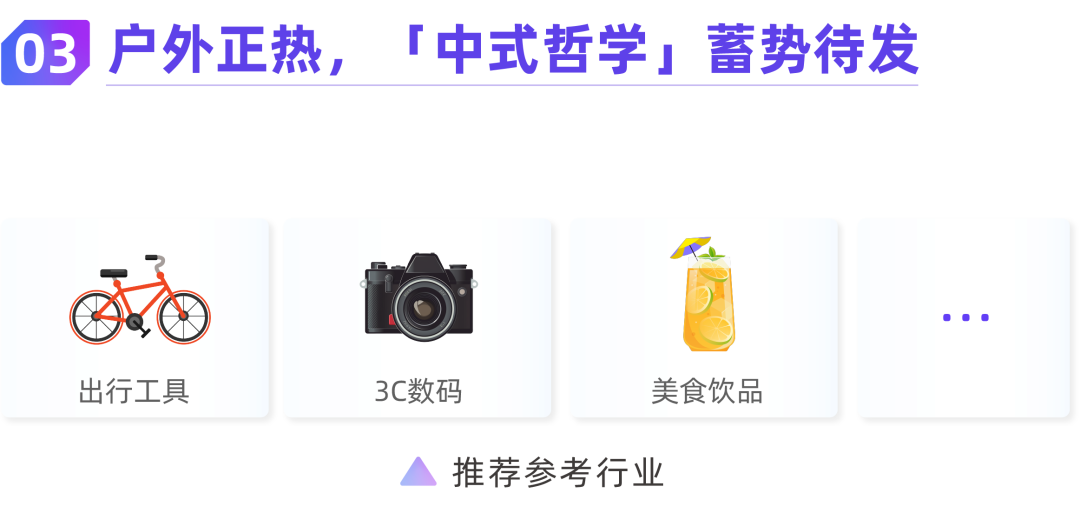 3、场景:抓住出游场景的观赏性与时效性,打造游玩、摄影等类型笔记;洞察“中式生活哲学”,把握时令特色,顺应消费行为。