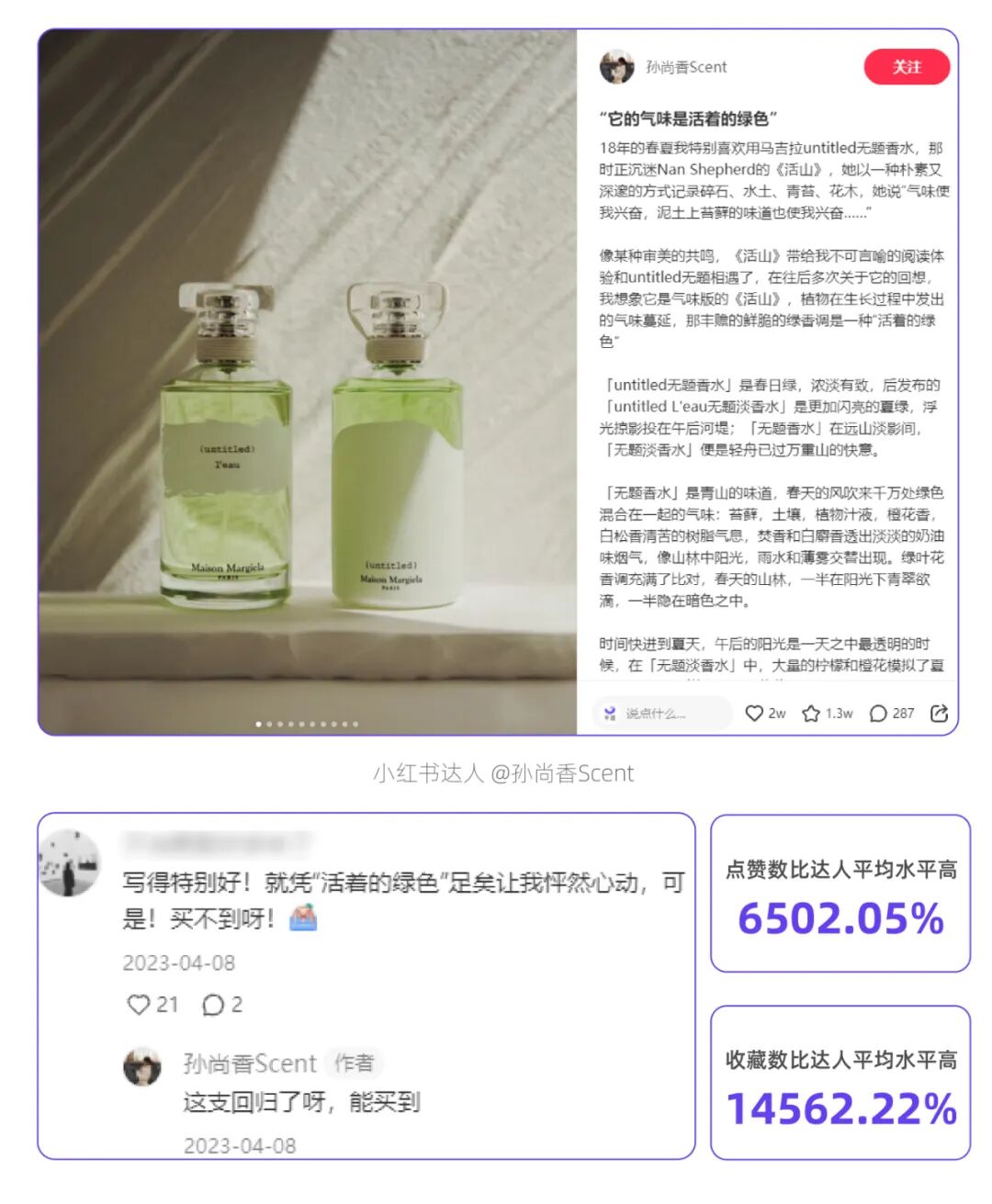 此前,梅森马吉拉香氛投放腰部达人@孙尚香Scent的笔记《“它的气味是活着的绿色”》引起关注。博主将气味、颜色、自然环境联系起来,唤醒用户感官体验,并借助春日相关意象(青山、春风、苔藓、雨水、薄雾、山林等),构筑了一种极具生命力的语境。评论热词中除了品牌词、购买意向词之外,“绿色”一词位列TOP14,更有用户称“就凭‘活着的绿色’就足以我让心动”,言语之间,借助“颜色”与用户达成精神互融,自然撬动转化。