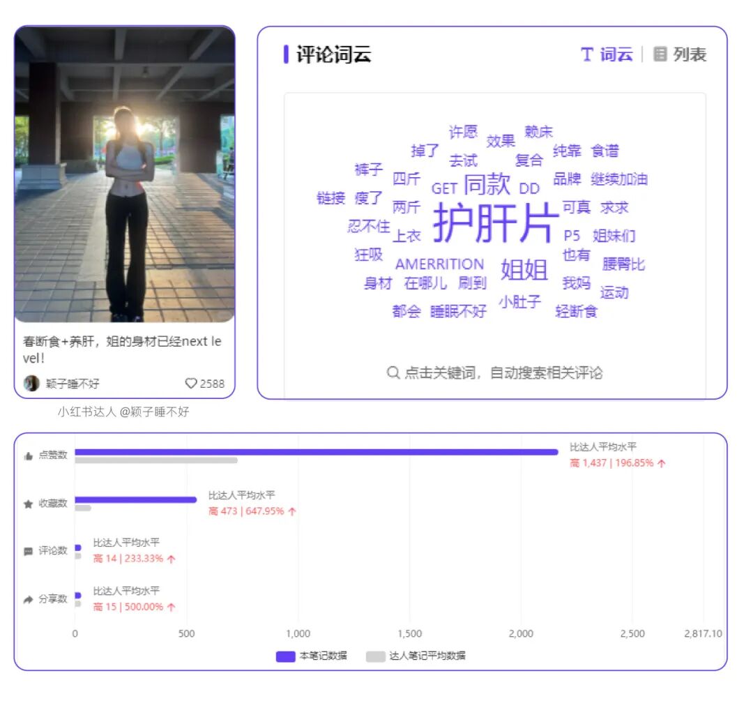 千瓜数据显示,保健品品牌 amerrition 投放的初级达人@颖子睡不好 的笔记《春断食+养肝,姐的身材已经next level!》,内容为结合自身经历分享“春断食”食谱与养肝方法,产品种草切中健身与养生人群的春日需求,评论词中“护肝片”位列TOP1,笔记点赞数高出达人平均水平196.85%,种草效果显著。