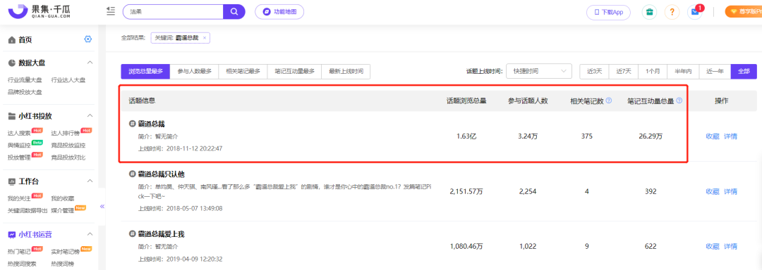 果集·千瓜数据显示:#霸道总裁 在小红书话题浏览总量高达1.63亿,其相关话题#霸道总裁只认他、#霸道总裁爱上我 的话题浏览量也高达千万。