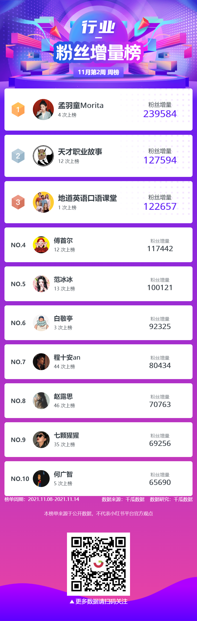 行业-粉丝增量榜中“孟羽童Morita”排名第一,粉丝增量239584;“天才职业故事”排名第二,粉丝增量127594;“地道英语口语课堂”排名第三,粉丝增量122657。