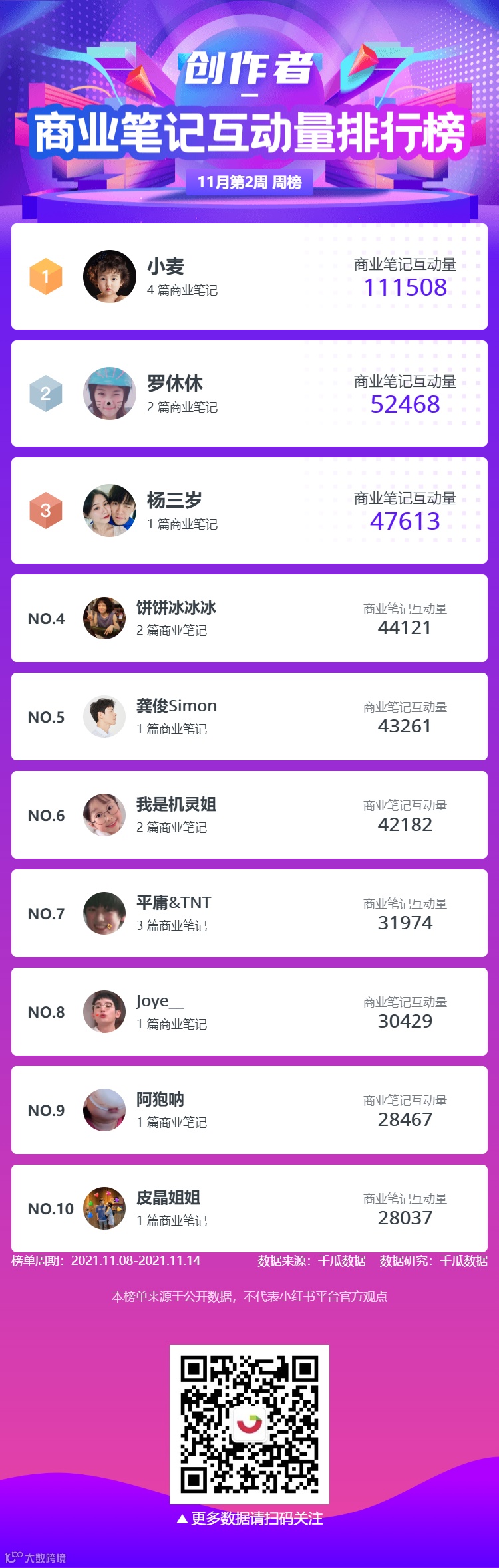 创作者-商业笔记互动量排行榜中“小麦”排名第一,商业笔记互动量111508;“罗休休”排名第二,商业笔记互动量52468;“杨三岁”排名第三,商业笔记互动量47613。