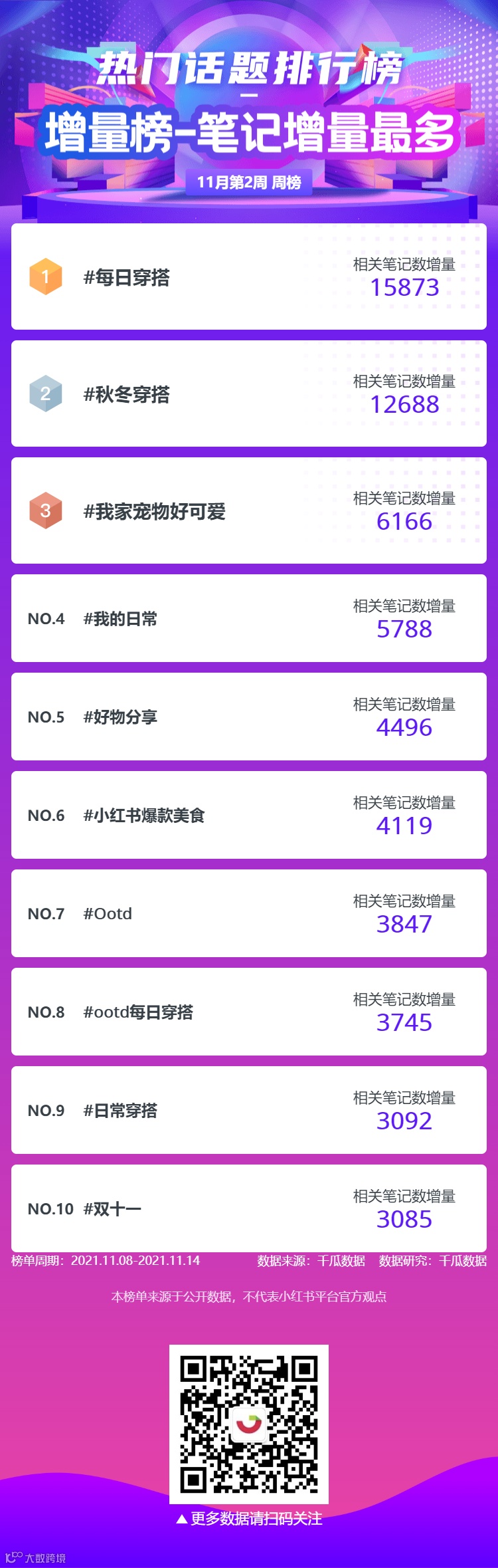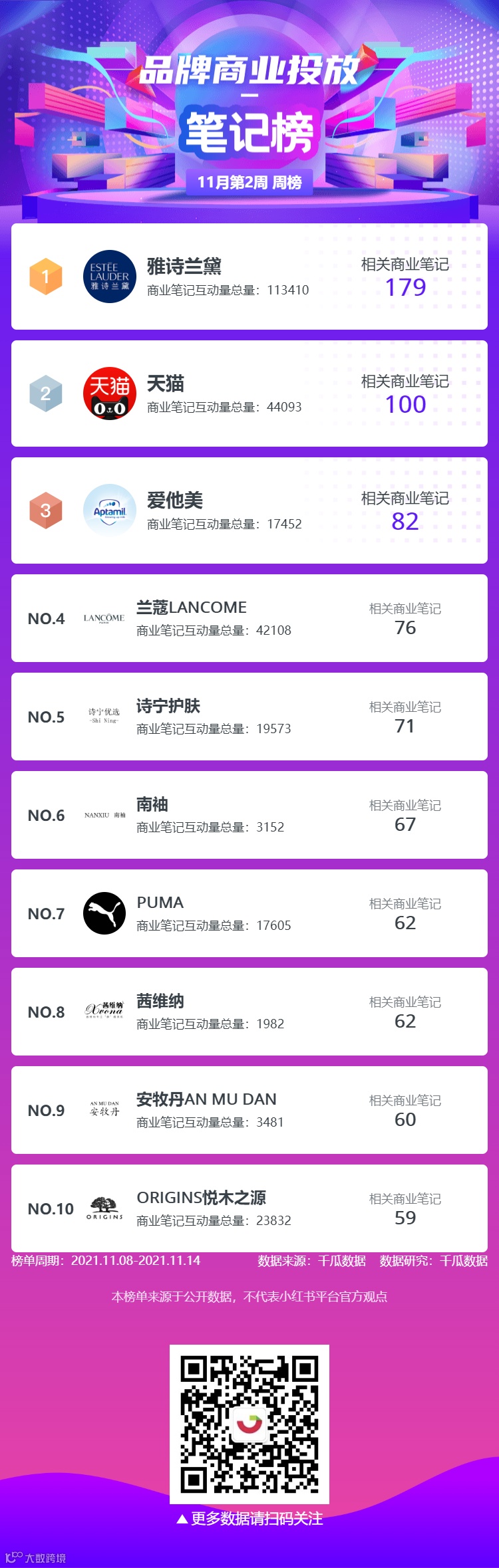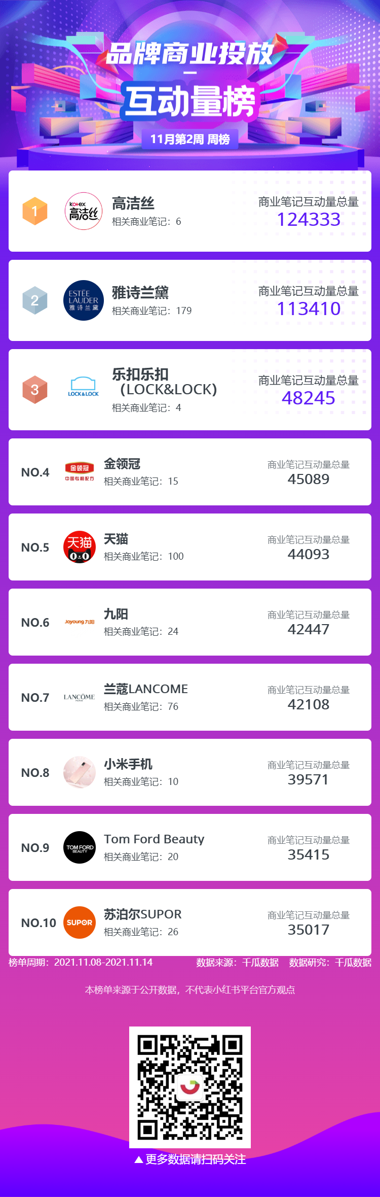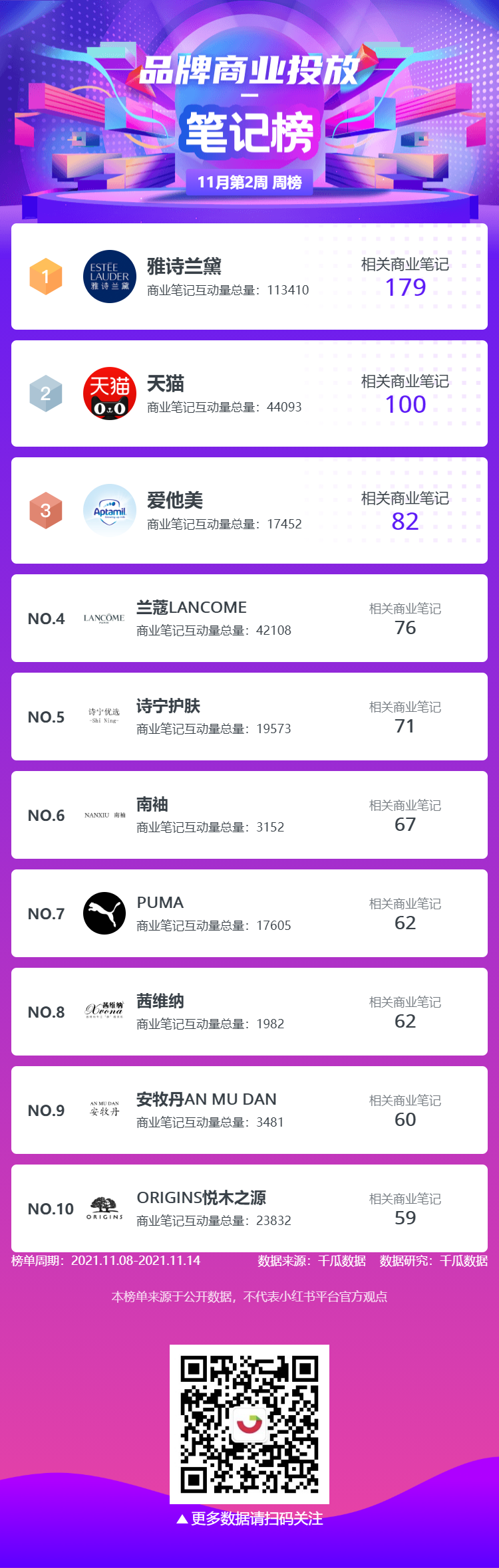 千瓜为大家整理了11月第2周五大榜单周榜(小红书平台),品牌商业投放榜-笔记榜、品牌商业投放-互动量榜、创作者-商业笔记互动量排行榜、行业-粉丝增量榜、热门话题排行榜,为大家提供小红书多方位的数据参考。