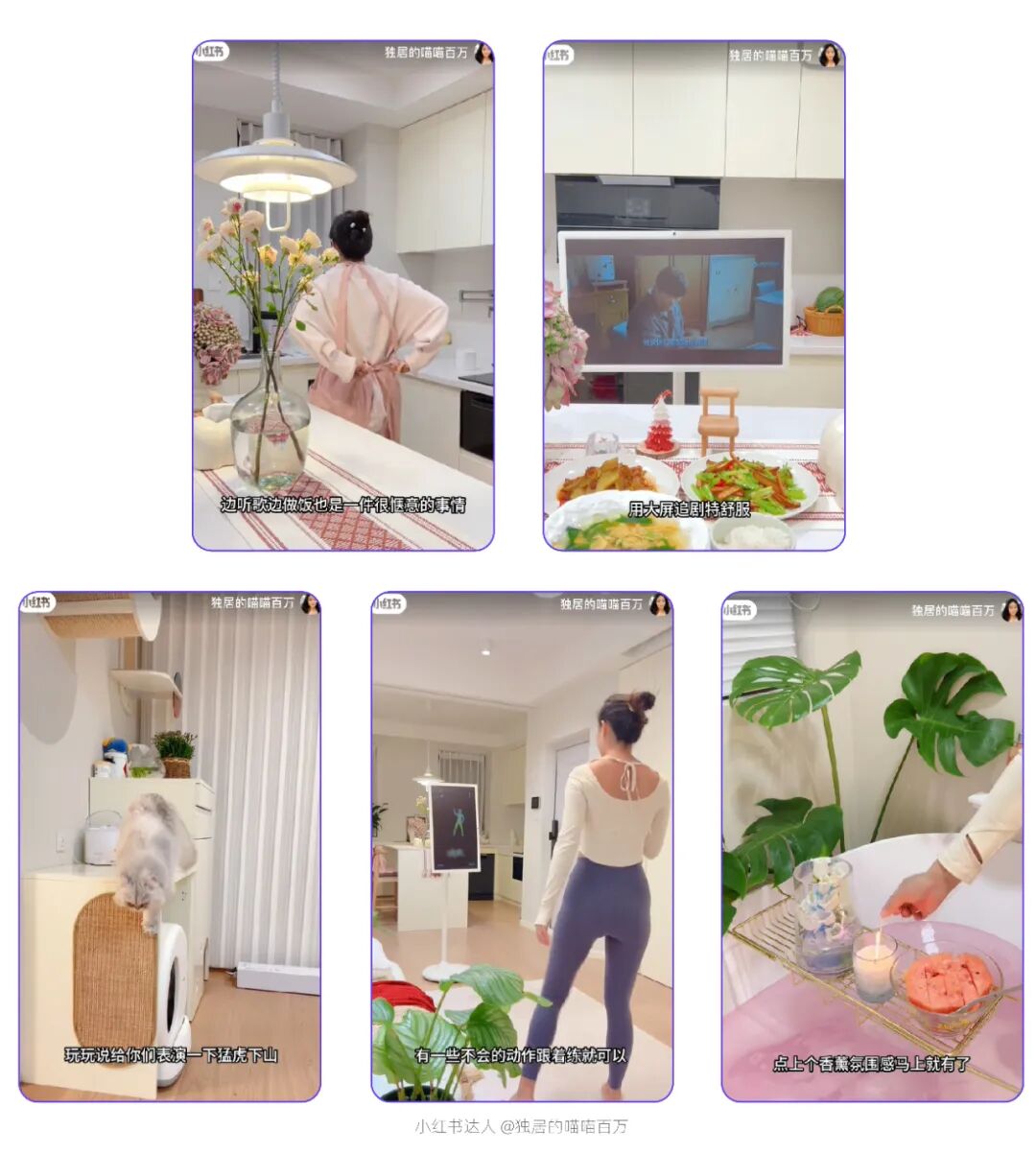 笔记文案“焦虑、生活不止一种可能性…”,奠定情绪价值。视频镜头从下班到家起幅,切换“做饭、追剧、运动、泡澡”多个景别,伴随着“少盐少油健康、对眼睛友好、被表扬很开心、一天中最惬意的时光”,不断释放打工人的需求信号,刺激对生活把握的渴望,全程有节奏地露出产品,通过下班后的闲者时光,自然地烘托放松休闲的产品属性与情景氛围。