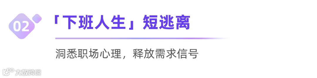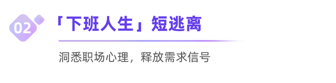 千瓜观点,下班场景丰富多样,包括宅家放松、夜校兴趣班、KTV精神钟点房……此外,“午休”也是潜在的短逃离场景,海底捞早在去年就部署了午休场景,网友直呼是打工人的快乐老家。品牌可通过这类“工位放生式”的内容,如下班人生、工位OOTD、午休散步等,达成职场人群的沟通与心智占领。