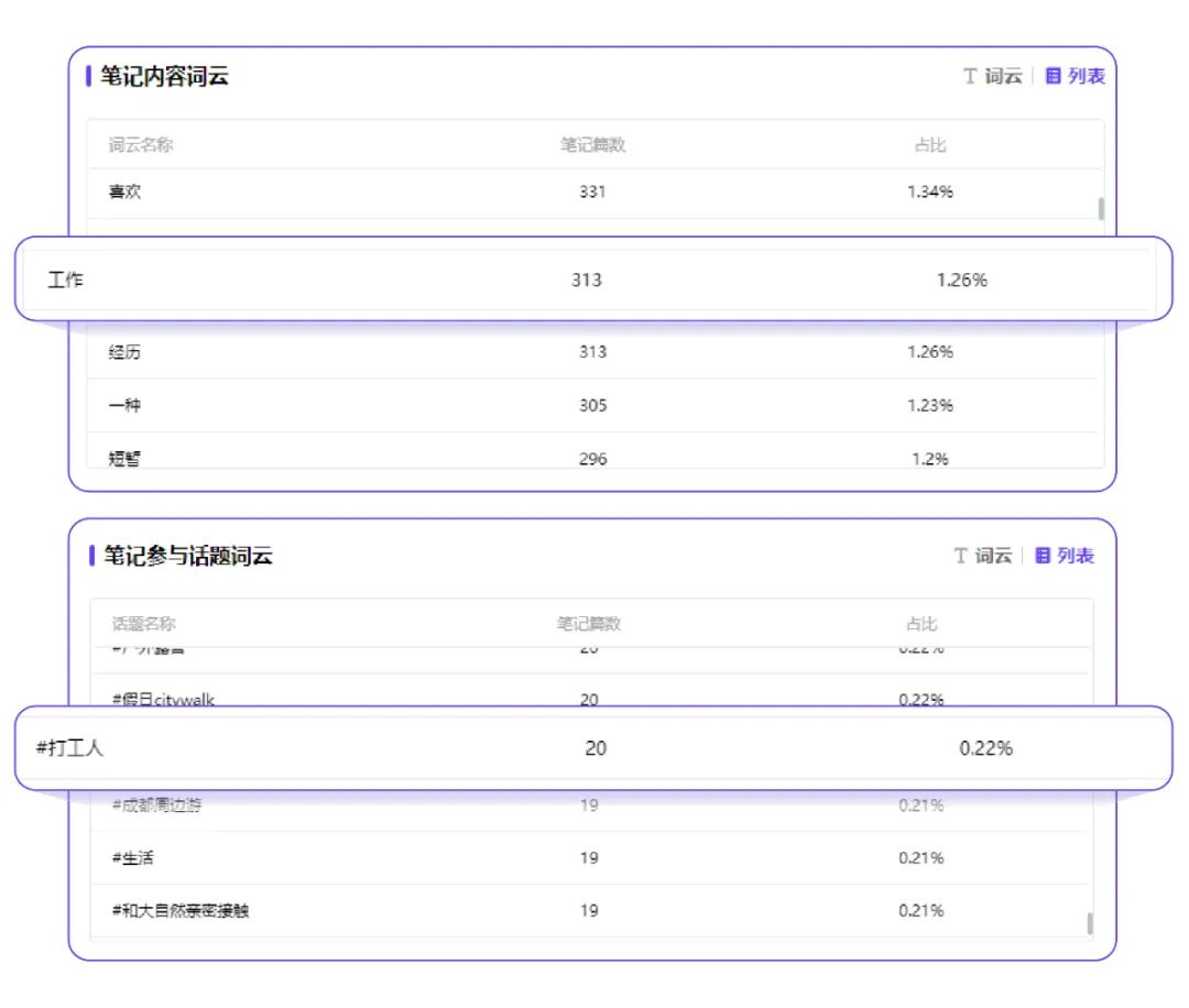 千瓜数据显示,“短逃离”关键词下的笔记内容热词和参与话题频现“工作、打工人”等。小红书平台关于“下班后4小时、下班后的生活”讨论热烈,相关内容预估年互动量达百万级,打工人纷纷在下班后开启“第二人生”。