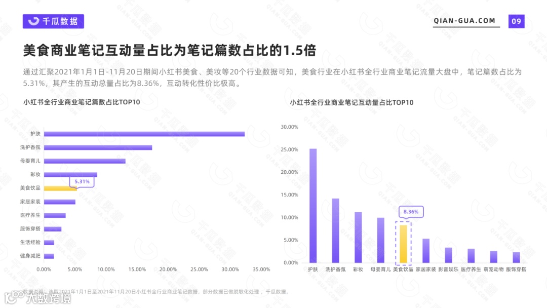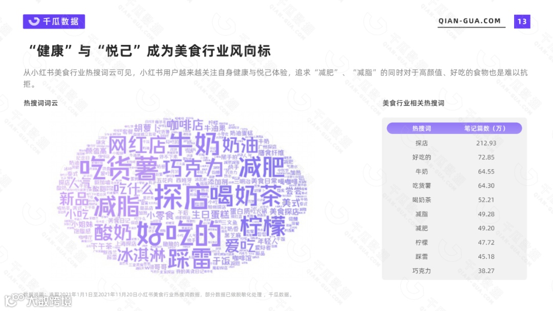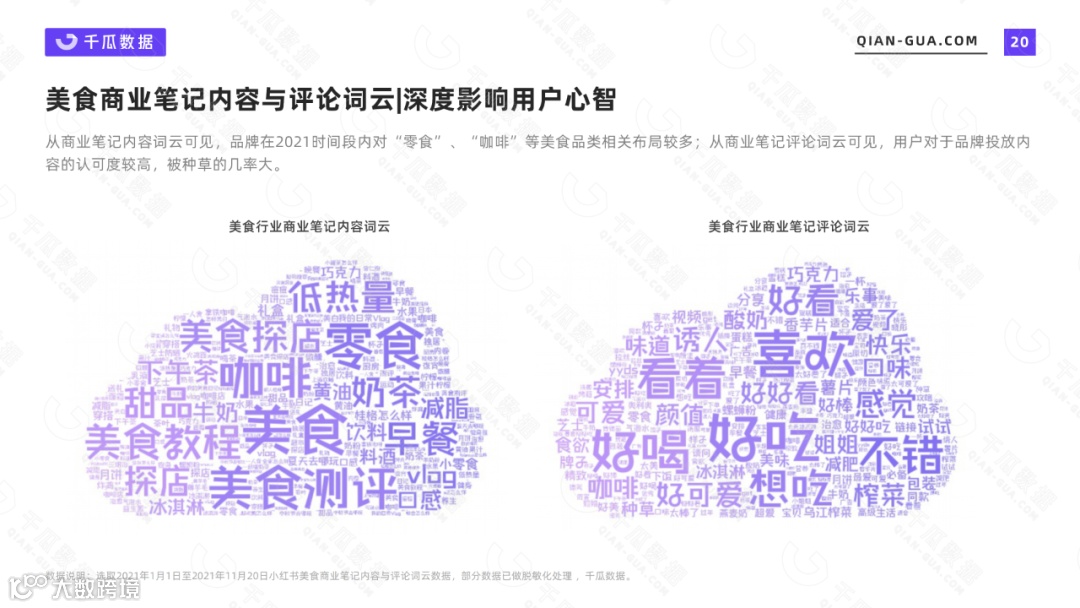《2021美食行业数据洞察报告(小红书平台)》共35页,更多数据维度尽在报告全文。如需完整版报告,请关注“千瓜”公众号,并在后台回复关键字“小红书美食”获取。