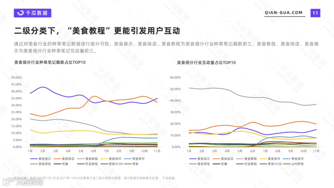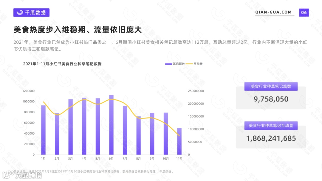 千瓜数据通过聚合2021年1月1日至11月20期间数据可知,美食行业种草笔记篇数975万+,所产生的互动总量高达18亿,且在下半年步入流量维稳期。
