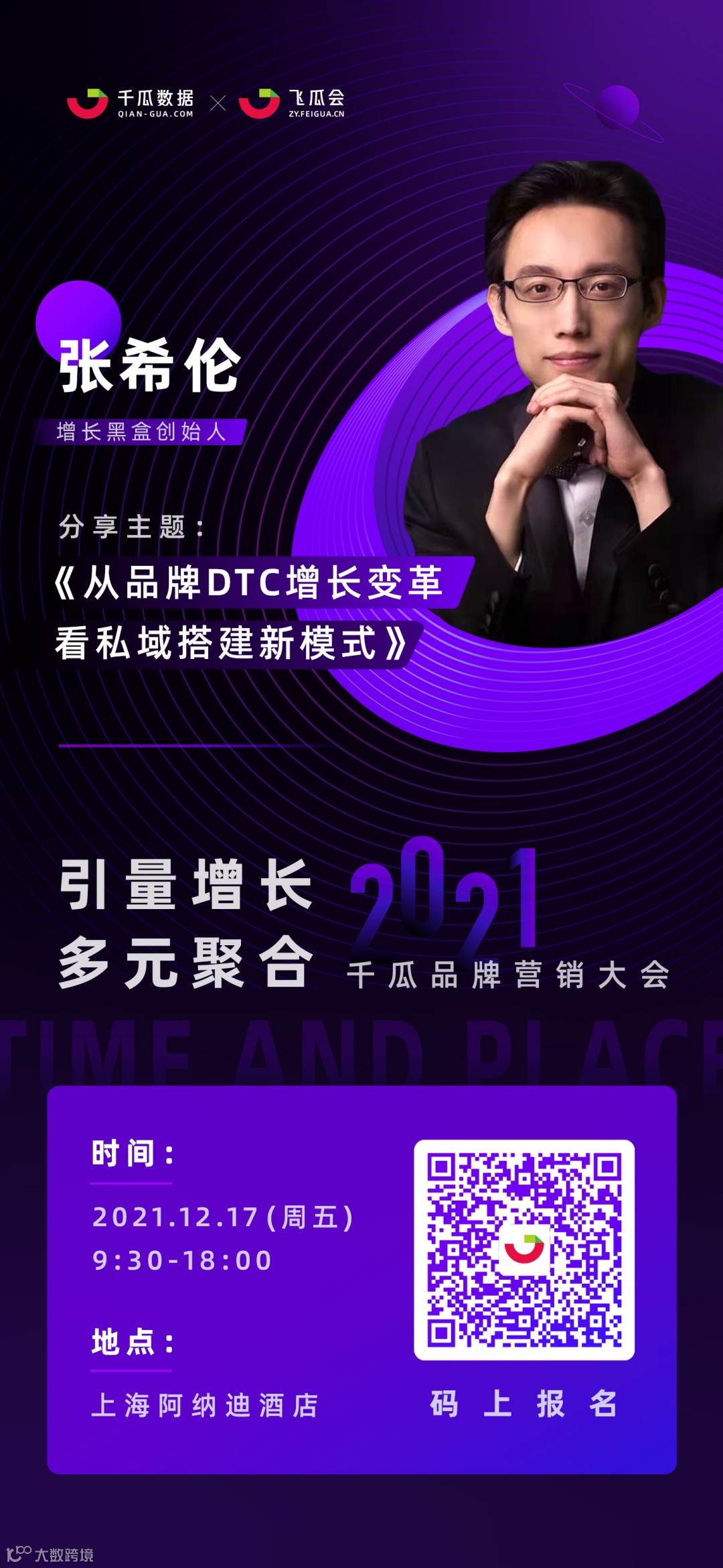 推荐各位品牌方、创始人及运营团队,来听千瓜品牌营销大会分享嘉宾增长黑盒:创始人-张希伦的主题《从品牌DTC增长变革看私域搭建新模式》。