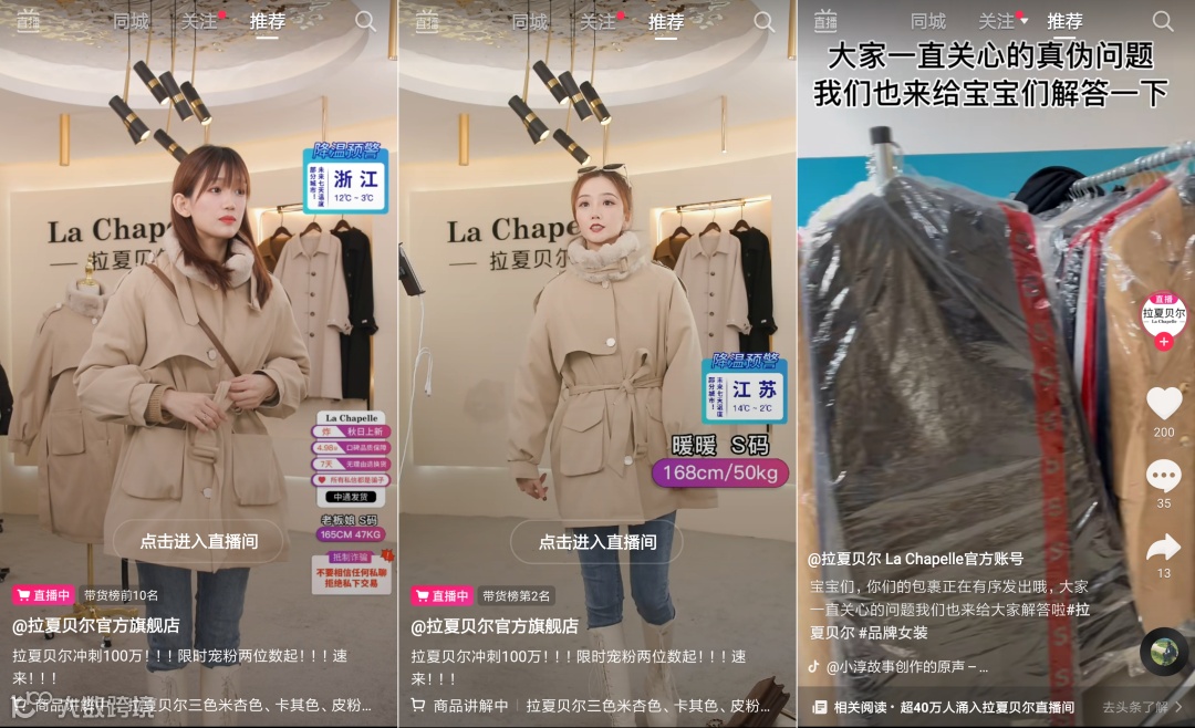 女装品牌“拉夏贝尔”近日也获得巨大关注,申请破产清算的消息引发“野性消费”,品牌直播间热度不断被拉高,近一周官方旗舰店单场直播最高收获近700万人次观看,预估销售额2200万。