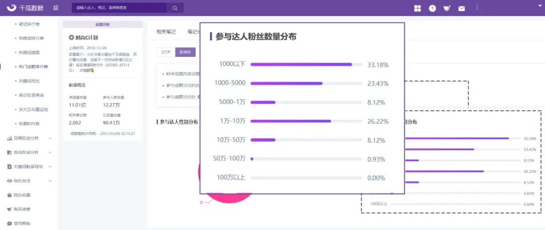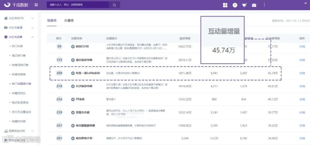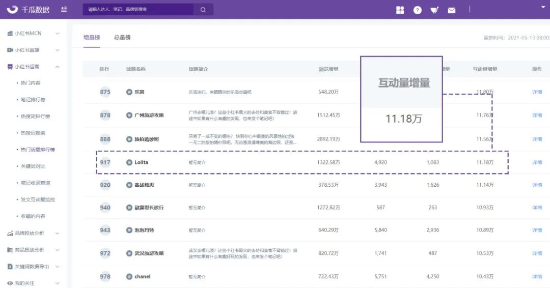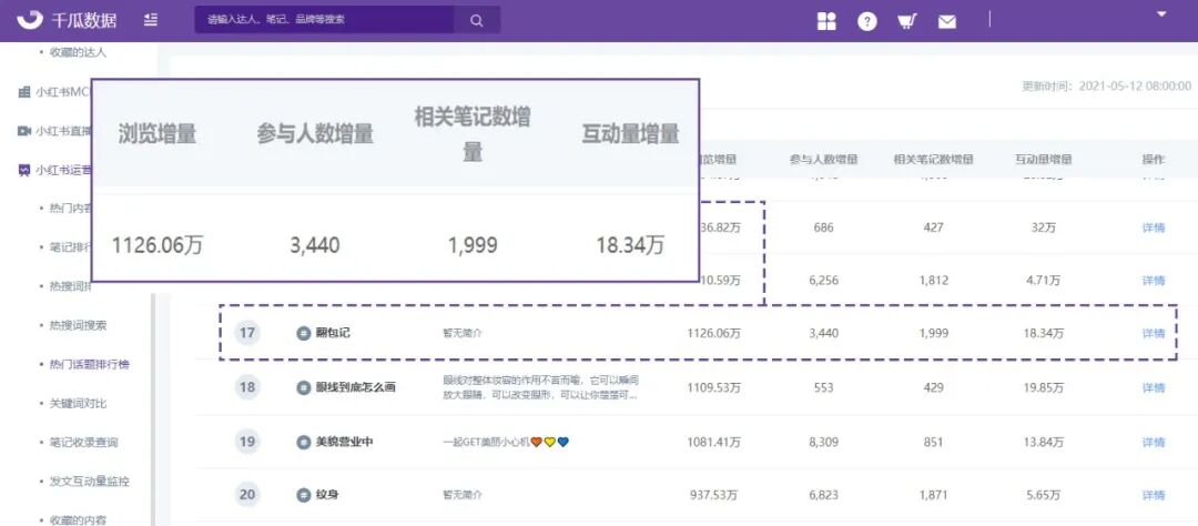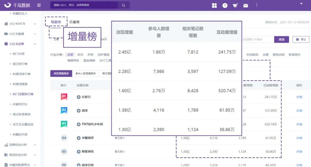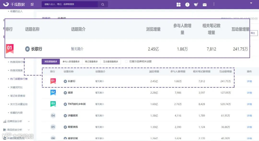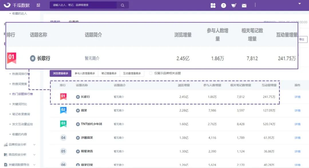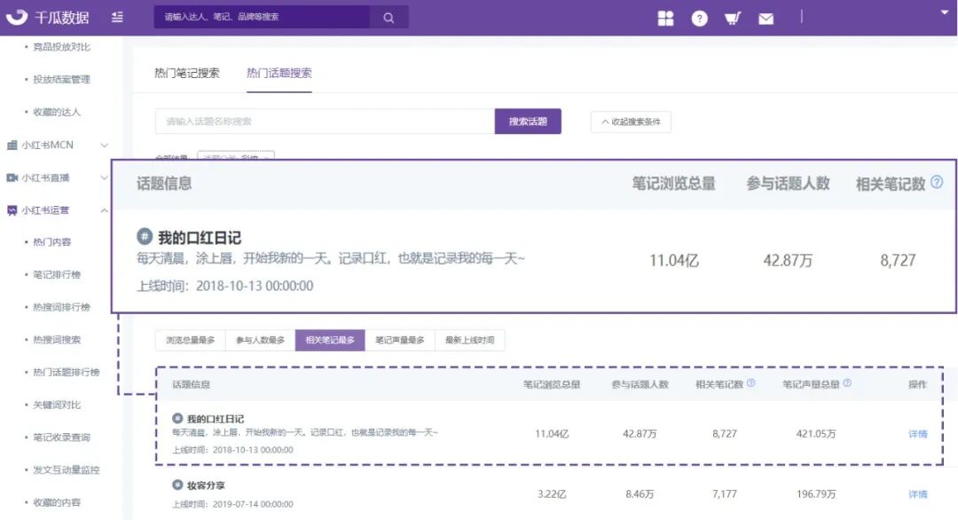 小红书热门话题榜不仅能实时反映笔记曝光流量情况,还能帮助品牌在投放前了解近期用户的需求,帮助品牌优化产品内容,有效提高笔记流量,打造良好的营销效果。千瓜数据热门话题榜功能一键即可助力品牌营销能力与分析能力。
