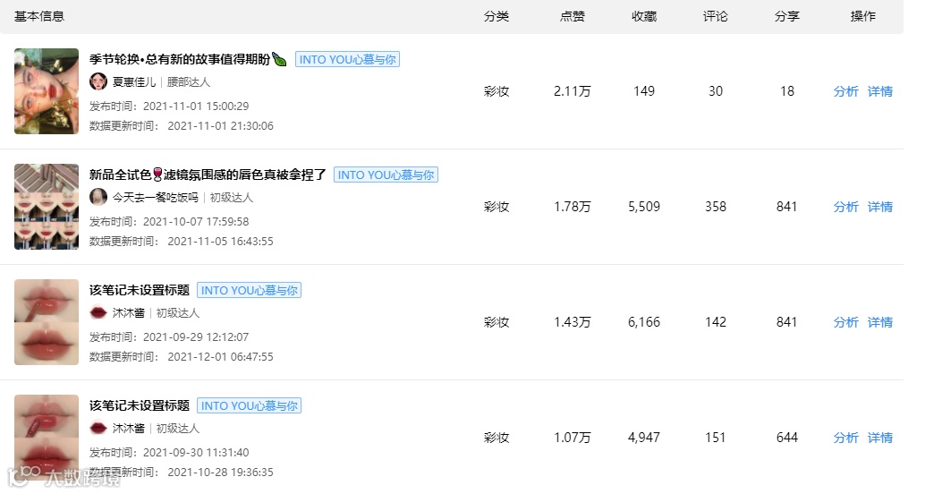 同样侧重于投放初级达人和腰部达人的新锐品牌INTO YOU,在双十一期间的报备笔记中,腰部达人和初级达人投放占比为95.83%,互动量贡献值占比为98%。INTO YOU筛选的达人中多数出现了爆文。可见,初级和腰部达人的种草能力和内容质量不容小觑。