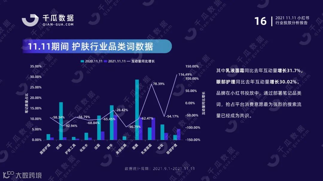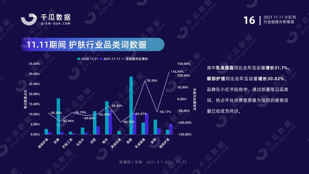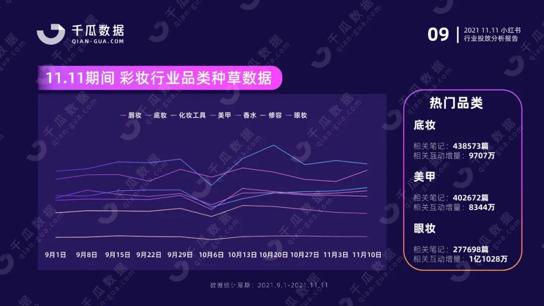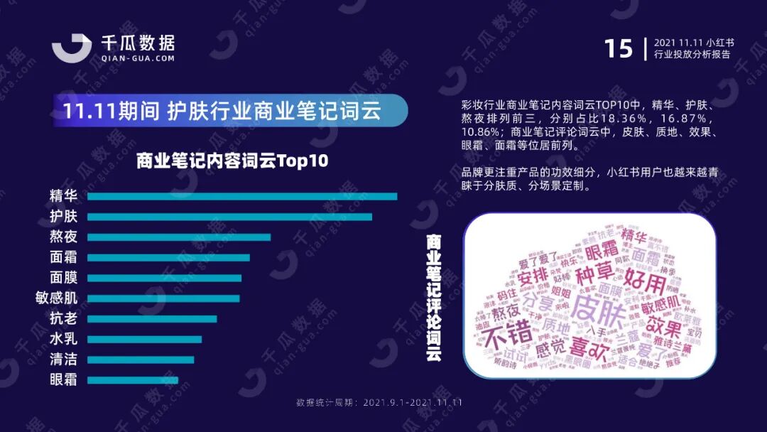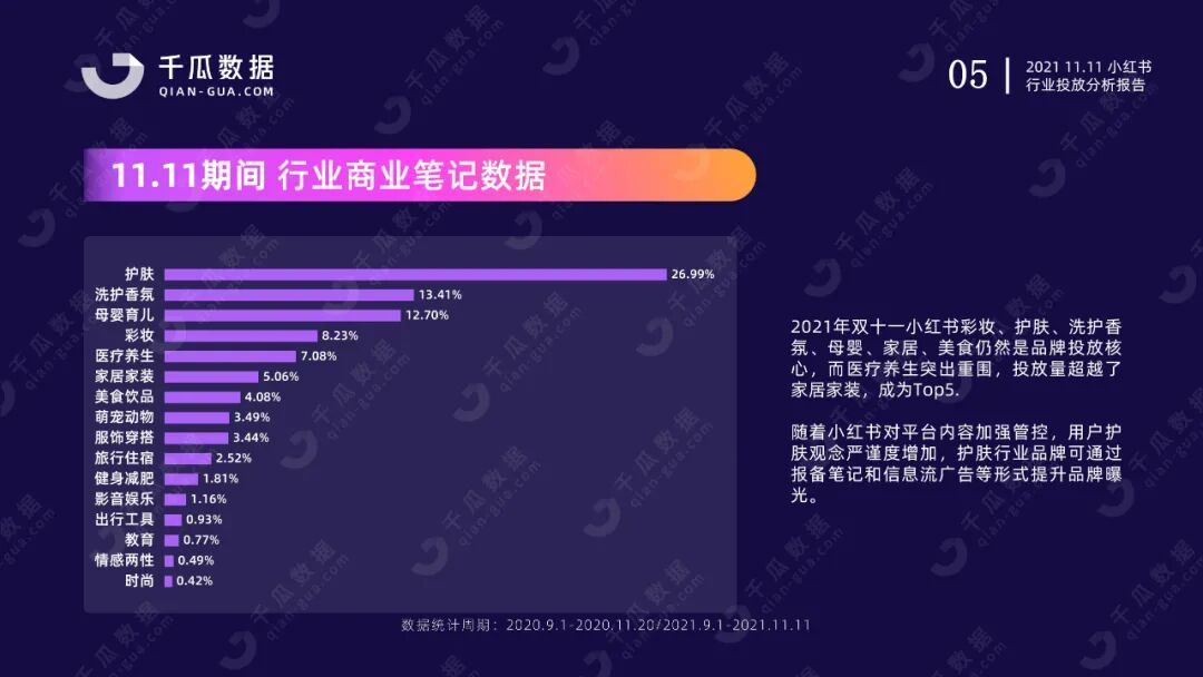 《2021年千瓜11.11行业投放分析报告(小红书平台)》报告共56页,更多数据维度尽在报告全文。如需PDF完整版报告,请关注“千瓜社媒洞察”公众号,并在后台回复关键字“2021双十一”获取。