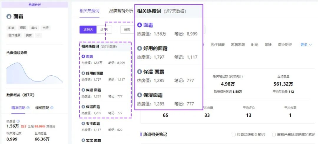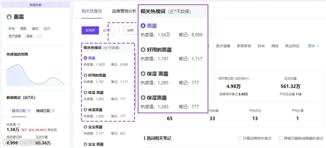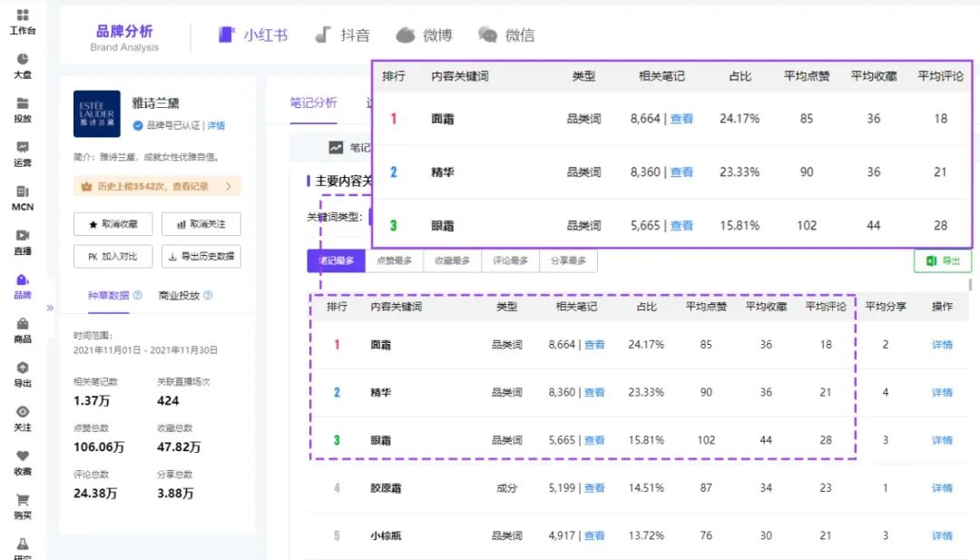 例如,雅诗兰黛在双十一期间的内容关键词,品类词“面霜”布局的相关笔记为8664,占比24.17%,显然面霜这一品类词的热度已经相当高了,如果再去和大品牌抢占这一品类词,势必很难抢占更多流量。
